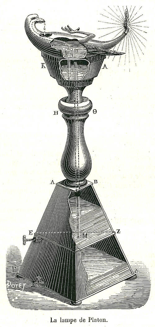 Il est probable que c’est à un artifice de cette nature qu’étaient dues quelques- unes des nombreuses lampes perpétuelles dont l’histoire nous a conservé le souvenir telles que celle que Plutarque a vue avec admiration en Égypte dans le temple de Jupiter Ammon [2] et celle du temple de Vénus que saint Augustin ne peut expliquer que par l’intervention des démons [3] ; mais la plupart d’entre elles ne devaient leur singularité qu’aux précautions prises par les prêtres pour les alimenter sans être vus. II suffisait, en effet, que la mèche, faite de fils d’amiante ou de fils d’or , se conservât intacte et que le corps de la lampe communiquât avec un réservoir placé dans une pièce voisine, de telle façon que le niveau de l’huile restât constant. Héron et Philon nous ont laissé la description d’un certain nombre de dispositifs permettant d’atteindre ce but [4].