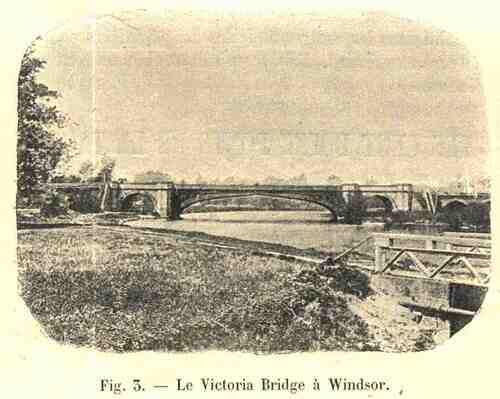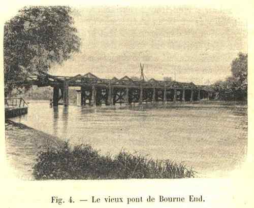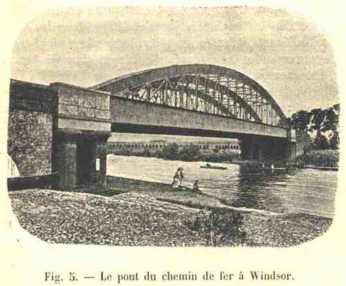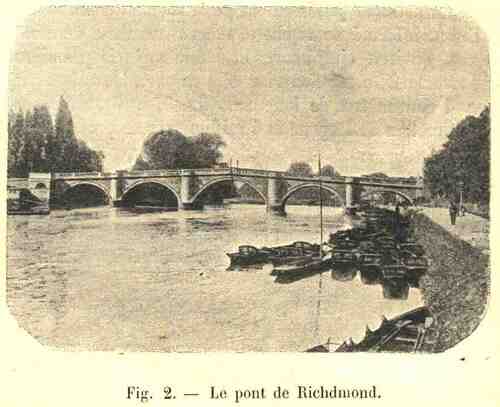 Quand nous arrivons à Kew, nous apercevons le vieux pont de 1782, avec son dos d’âne si prononcé, caractéristique de l’époque de sa construction, et si gênant pour la circulation. Nous passerons vite sur la passerelle de Richmond, qui est formée de deux ponts pour piétons construits parallèlement l’un à l’autre et laissant entre eux l’espace disponible pour relever des barrages destinés à modifier le plan d’eau de la Tamise. A Windsor, nous franchissons un pont métallique formant une voûte en anse de panier assez rare, voûte extrêmement surbaissée et répondant aux nécessités locales ; un peu plus loin, c’est une construction qui nous fait sourire maintenant ; car, bien que la travée unique n’ait pas 60 mètres, on a cru devoir soulager les poutres métalliques au moyen de deux autres poutres formant une portion de cercle et soutenant les poutres horizontales par de puissants tirants entre-croisés. Ce système fut imaginé en 1840 par J. K. BruneI.
