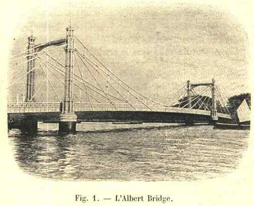 Ce sont encore des arches en fer forgé, en maçonnerie, puis les deux grandes poutres à travées indépendantes, et même séparées, du pont de Charing-Cross, qui portent, suspendues transversalement de distance en distance, les pièces de pont, les petites poutres soutenant le tablier. Voici des ponts suspendus, comme celui de Lambeth, qui est. partagé en plusieurs travées au moyen de tours sur lesquelles le câble prend appui, et que supportent des piles au milieu du lit de la rivière ; plus haut, c’est l’Albert Bridge, curieuse construction du type suspendu également, où les câbles obliques partant des tours métalliques viennent se rattacher au tablier du pont.