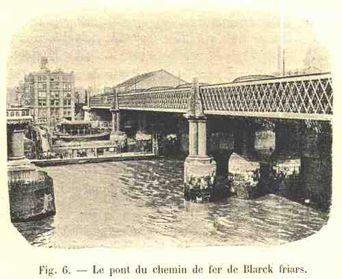 Voici le célèbre London Bridge, le « Pont de Londres », qui date de 1831, et n’a pas coûté moins de 35 1/2 millions de francs. On ne peut pourtant pas dire que celle construction en pierre présente un intérêt bien particulier : ses arches n’ont guère qu’une quarantaine de mètres d’ouverture, la largeur totale de sa chaussée ne dépasse point 13,60m ; mais c’est le pont du monde qui donne passage à la circulation la plus intense. Rien que dans le parcours du fleuve à travers l’immense métropole, nous trouvons les ouvrages les plus divers : piles cylindriques en fonte imitant des colonnes doriques et supportant un tablier droit en fer forgé ; arches entièrement en fonte d’une ouverture de 73 mètres et s’appuyant sur des piles en maçonnerie. Lisez chacune des descriptions minutieuses données par M. Dredge, et vous y verrez également les divers systèmes qui ont été employés pour foncer les piles de tous ces ponts.