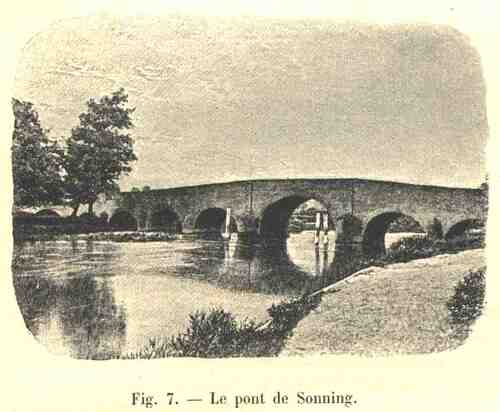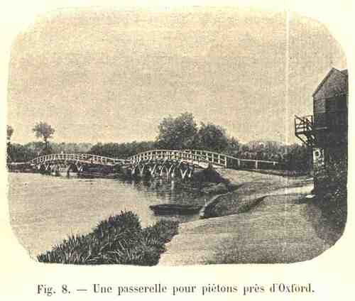 Ce sont là des dispositifs qu’on n’adopte plus guère, et qui prennent plutôt place dans le domaine historique ; si nous voulons pénétrer plus avant dans celui-ci, nous n’avons qu’à continuer de remonter le cours du fleuve. Nous trouverons le vieux pont de Sonning, élevé au milieu du siècle dernier : ses arches de briques demi-circulaires vont en décroissant de diamètre du centre du pont vers les rives, jusqu’à ne plus avoir que 4 mètres d’ouverture. Et si nous jetons encore un coup d’œil sur le pont de Culham, dont la construction remonte à 1416, et dont les arches basses et étroites, en forme d’ogive surbaissée, ne donnent qu’un étroit passage aux eaux ; si nous comparons ces massifs énormes, ces voûtes épaisses et difformes avec les arches légères des ponts modernes, nous nous rendrons bien compte des progrès admirables faits dans l’art de la construction des ponts.